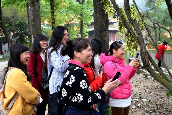 煙霧朦朦,綿綿的春雨為活動增添了幾份雨趣。活動的第一站是圭峰山國家森林公園,公園內秀峰挺拔,林木蔥蘢,挺秀的圭峰、蜿蜒的云峰,交匯中擁出世外桃源般的綠護屏,大家三五成群,一邊欣賞春天的美景,一邊呼吸著大自然的清新空氣,在細雨籠罩下,盡情享受這情深深雨朦朦的意境。