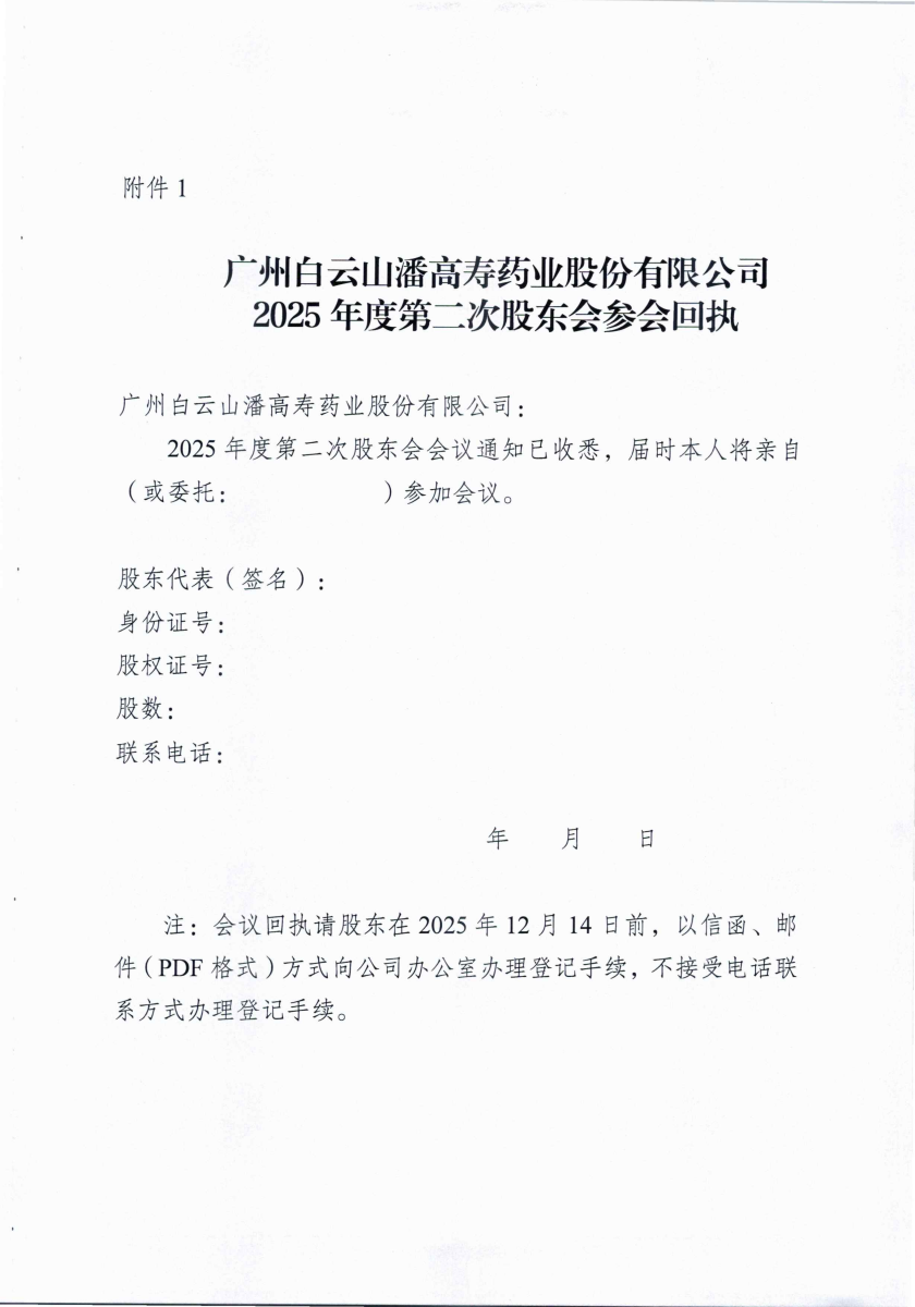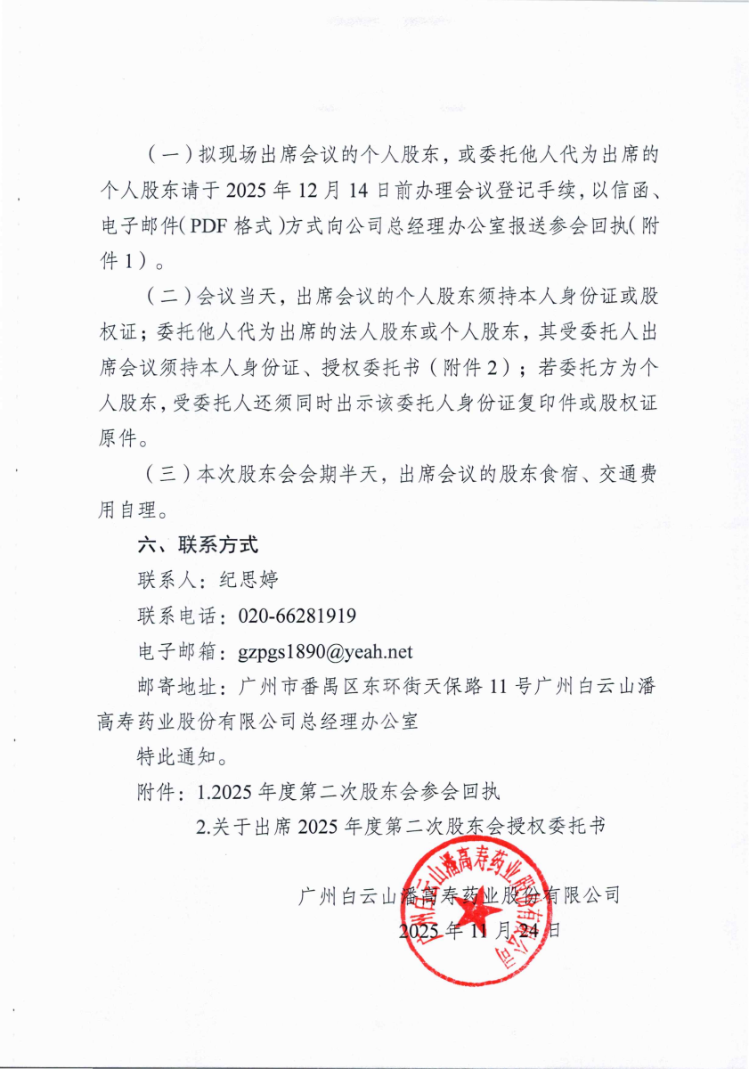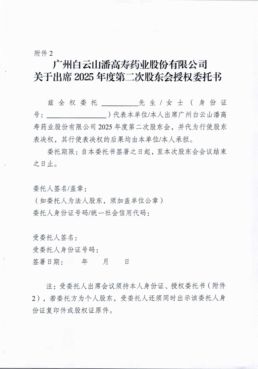 廣州白云山潘高壽藥業股份有限公司關于召開2025年度第二次股東會的通知